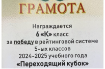 17 ноября на линейке «Поднятие государственного флага» 6 «К» классу были торжественно вручены кубок и грамота за победу в рейтинговой системе среди 5-ых классов по итогам 2024-2025 учебного года.